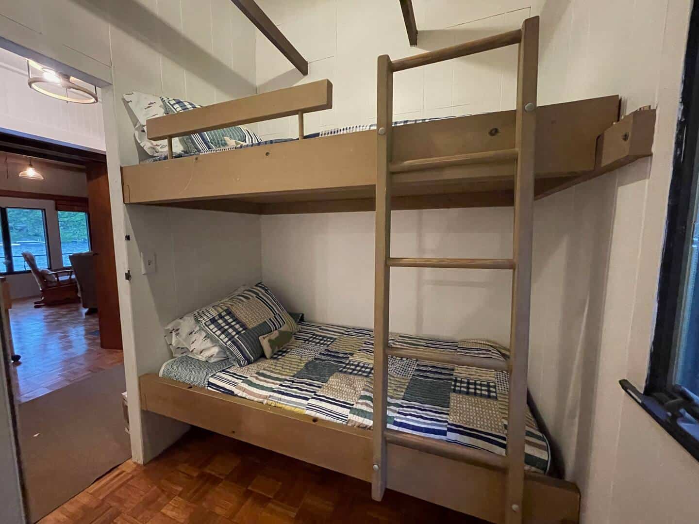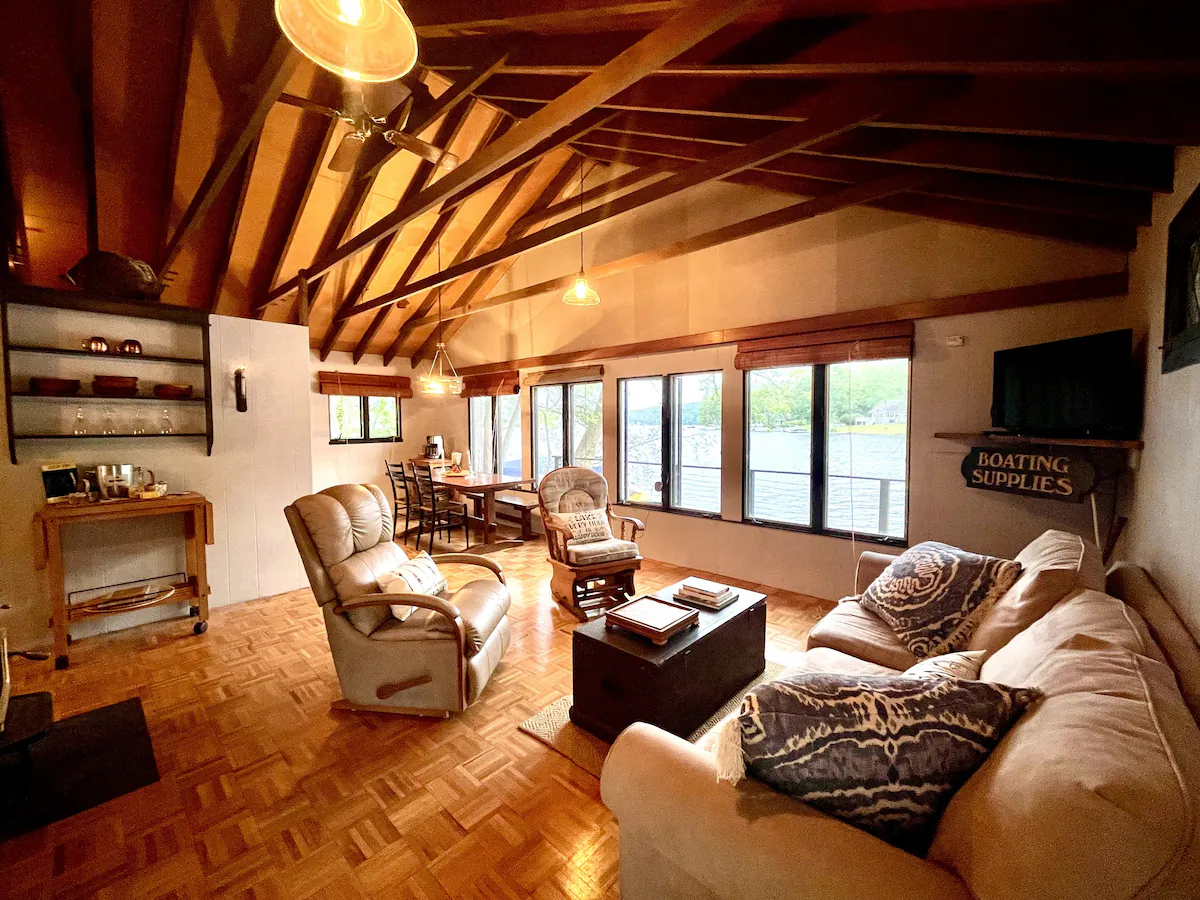 You'll pull into a paved parking area and then enter the house through the patio door via keyless entry. The cathedral main room takes in the view of the lake, enjoys wood floors, ceiling fan, windows to let the lake breeze blow through (there is a/c if you'd prefer) and cable and apple TV. Enjoy coffee or your favorite beverage on one of the two decks in comfy lounge chairs, comfy enough to nap in too. The patio has a "Solo" wood fire pit, outside dining and access to your own private dock (when the lake is "swimmable", of course we pull it for the colder months:)) We keep corn hole, lawn dice, spike ball and tiki toss nearby for the competitive side of you. The kayaks are ready to go out whenever you are, the resident eagles are impressive to catch a glimpse of and it's a rare day you don't see the loons. There is a dedicated work area for those moments when you must connect to reality. The bathrooms have been freshly renovated. The main bedroom has a king bed, double closets and a view of the lake, the second bedroom has two built-in twin beds and a built-in desk. Overflow sleeping in the built-in bunk that is located in a hallway is fun for all ages. There are yoga mats, board games, puzzles and a small library and a few toys to enjoy. There are extra throw blankets for curling up with your favorite book in the rocking chair. In the winter you can bring your ice skates, nordic skis or try your hand at ice fishing.