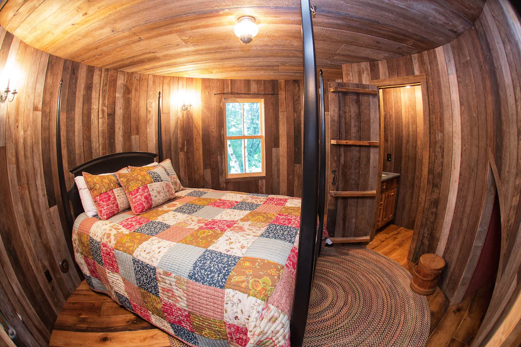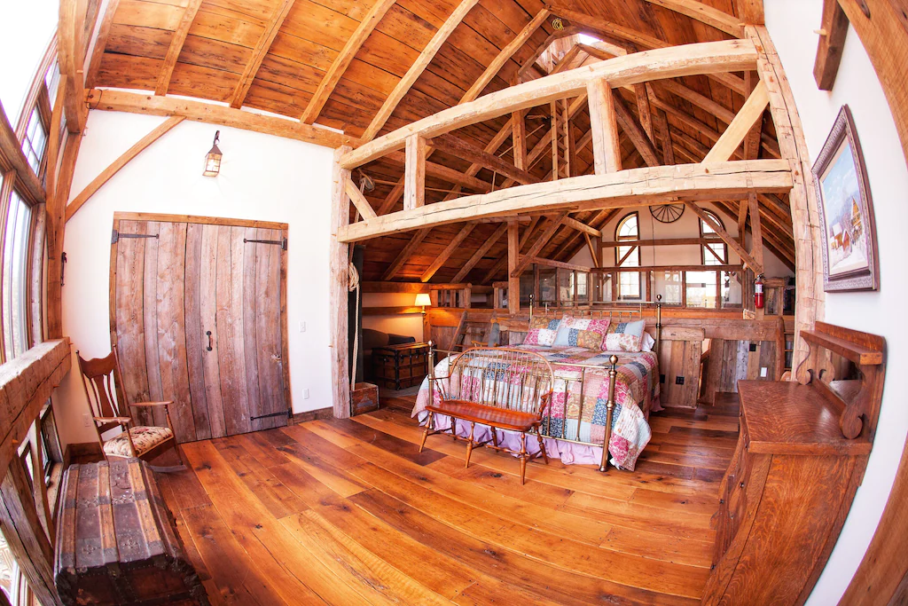 A hallway connects the main barn home with the 4 story silo. The first floor of the silo has a private bedroom and with a half bath (sink & toilet). The second floor is a breathtaking bathroom with a separate water closet for the toilet, two large showers with bench seats in each, and a round three sink vanity located in the middle of the room. The third floor is a private bedroom, and the fourth and final floor of the silo has two sets of bunk beds, sleeping 4 children comfortably, and a unique domed ceiling.