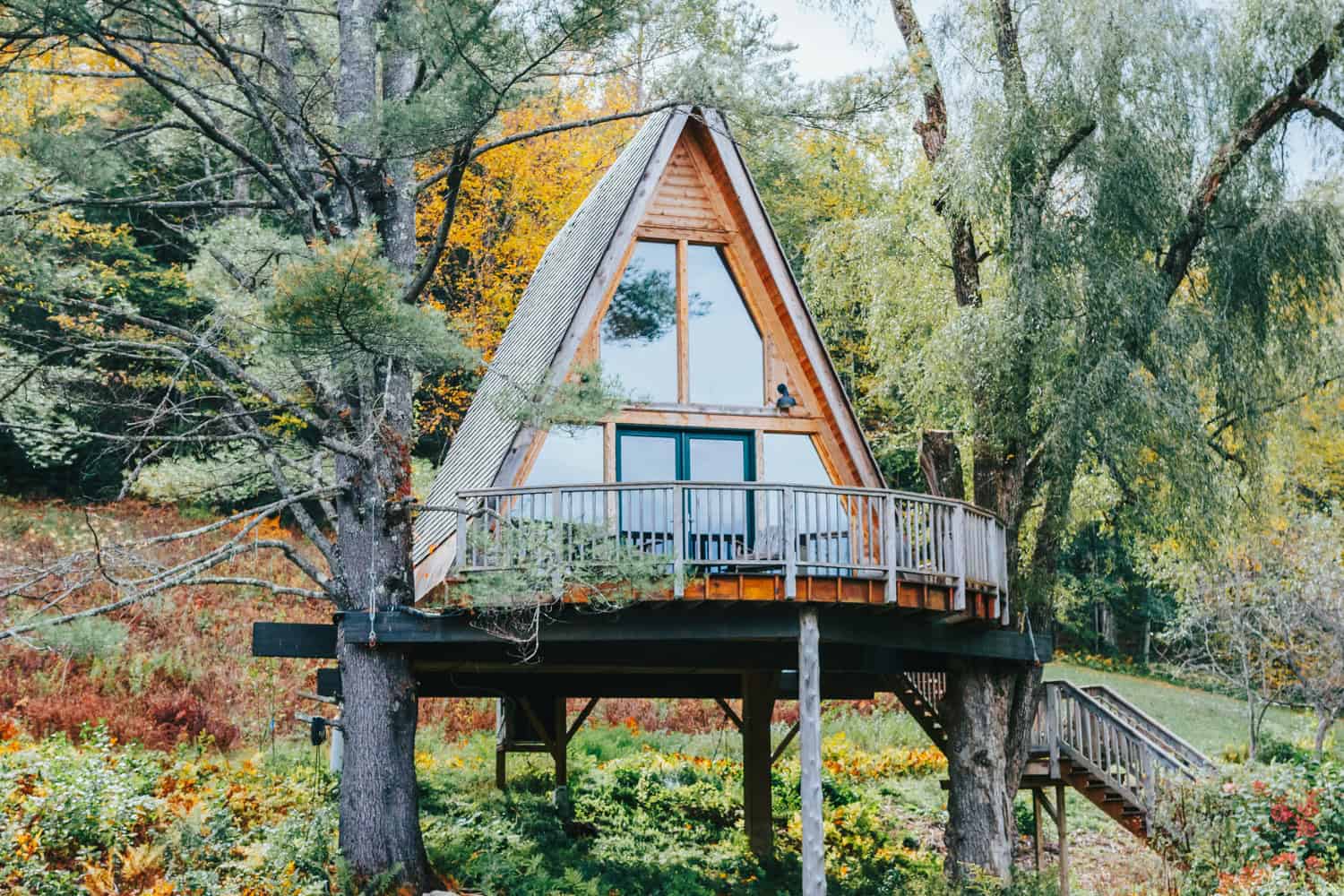 Nestled on a gentle hill overlooking a serene pond, the Treehouse at Willow is a sanctuary for the lifelong adventurer. This modern abode, designed and built by the legendary treehouse-builder, Pete Nelson, encapsulates the whimsical spirit of southern Vermont. With its A-frame design adorned with cedar and copper cladding, it's a seamless blend of rustic charm and contemporary elegance.