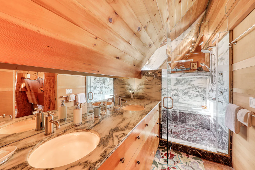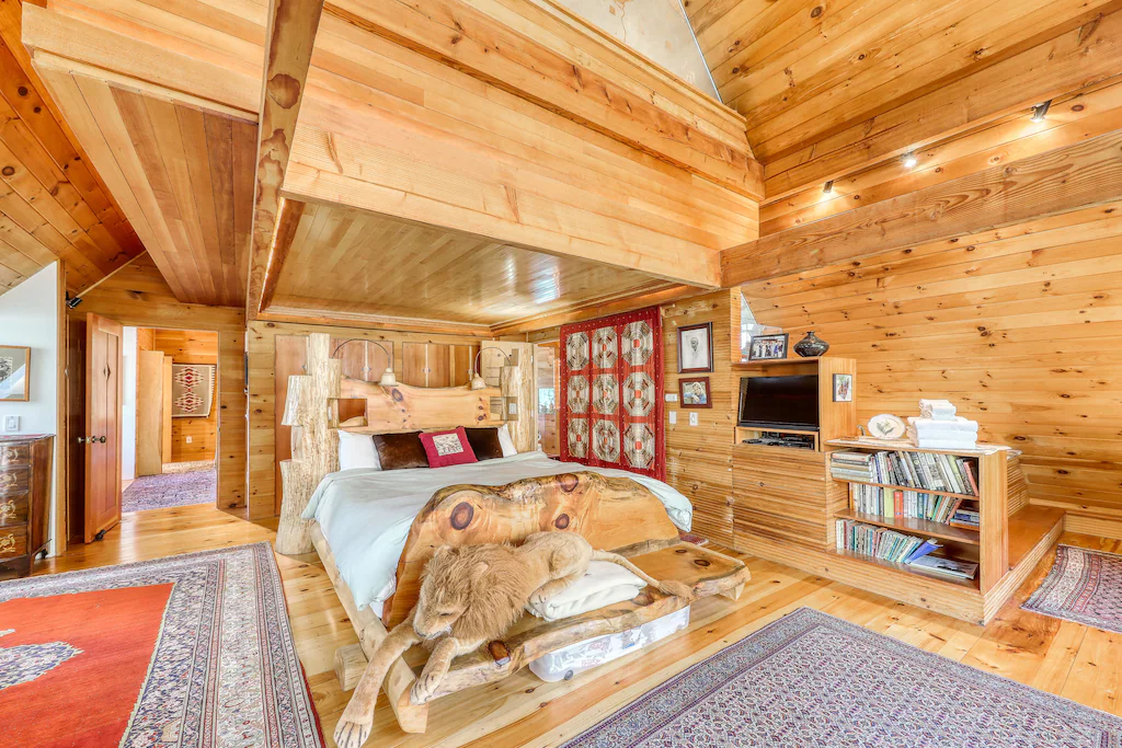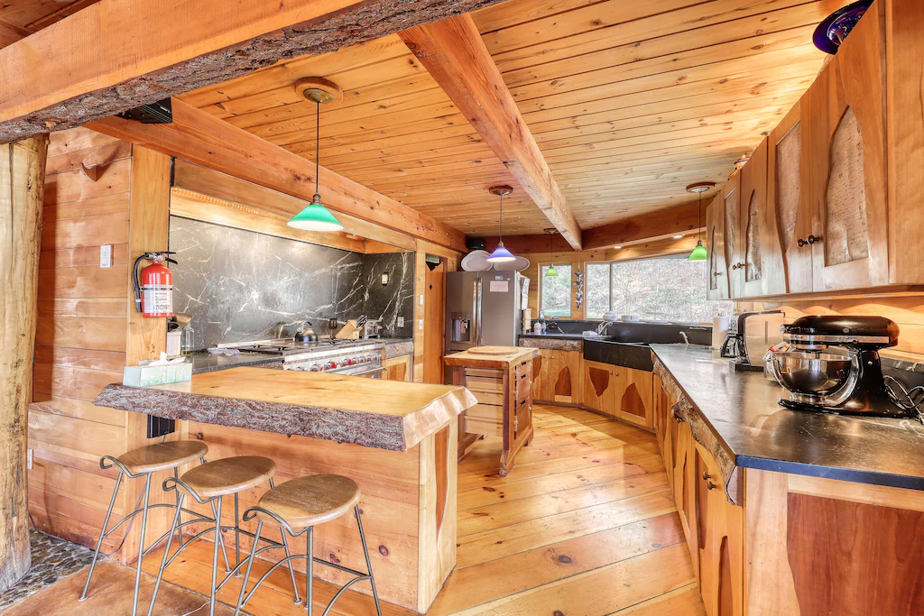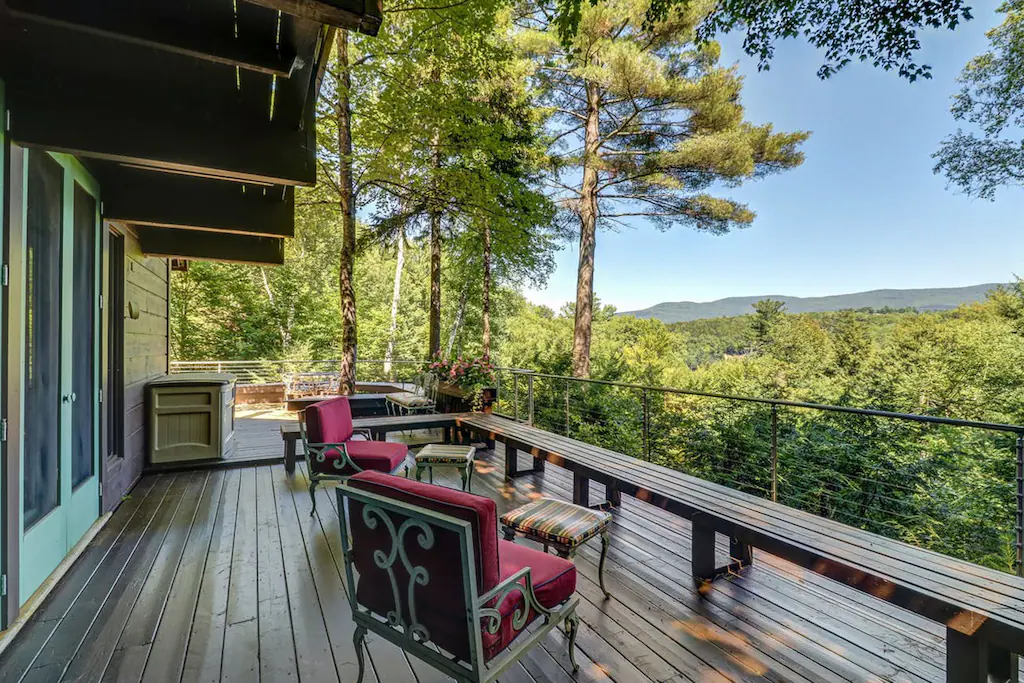 This secluded and private architect-designed lodge sits on eight acres and is ready to be your next home away from home in beautiful Warren, Vermont. Featuring a beautiful full kitchen, a furnished deck, and breathtaking treetop and mountain views, this rental is ideal for your next big family ski-cation or summertime getaway.