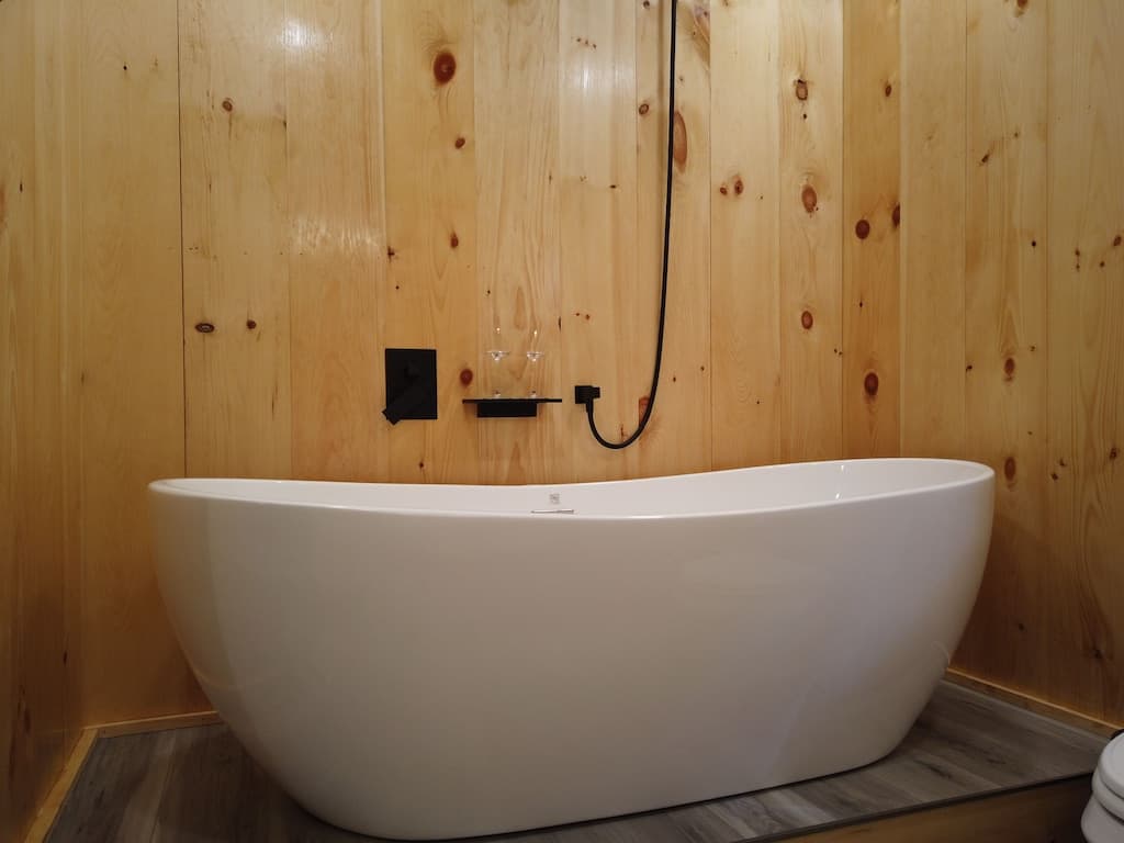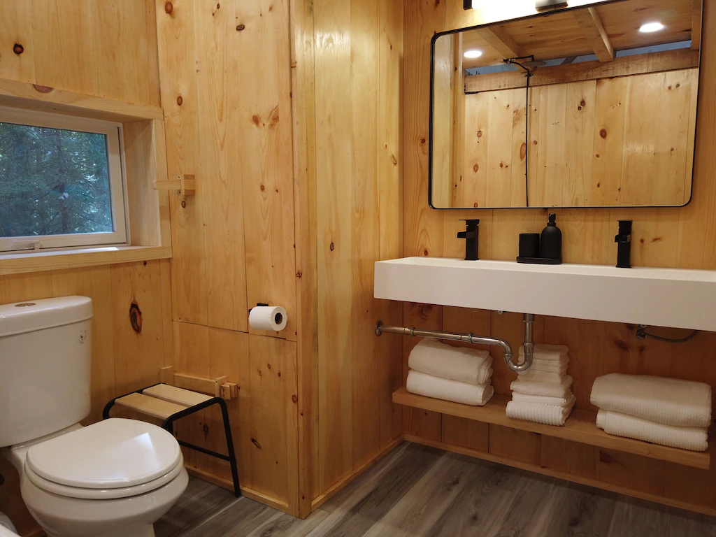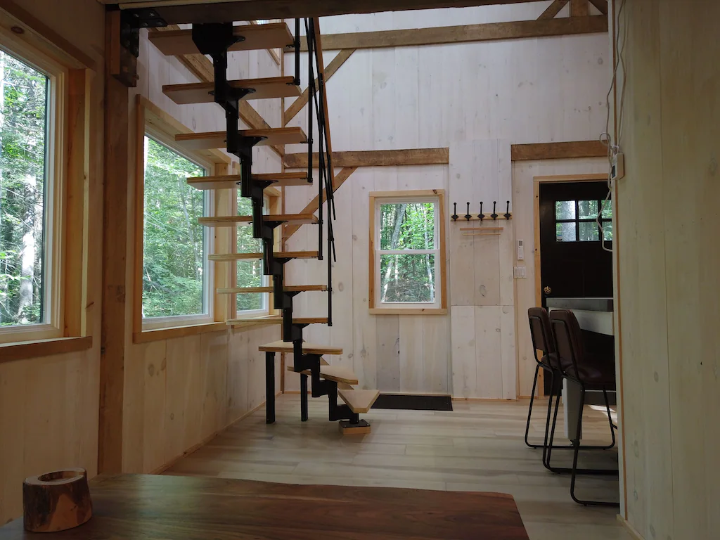 The Timbery: This is a brand new, fully handmade, timber frame "tiny" house. The house is nestled in the forest, accessible by foot. With 17 vertical ft. of floor to ceiling windows, this property represents a unique experience to fully immerse yourself into nature. It is like lying down on the forest floor and looking out the front of your tent. Except instead of wet sleeping bags and dirty hair, you enjoy a queen sized bed, in home theater, full kitchen and 71in soaking tub.