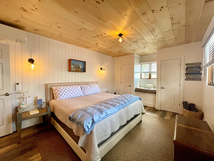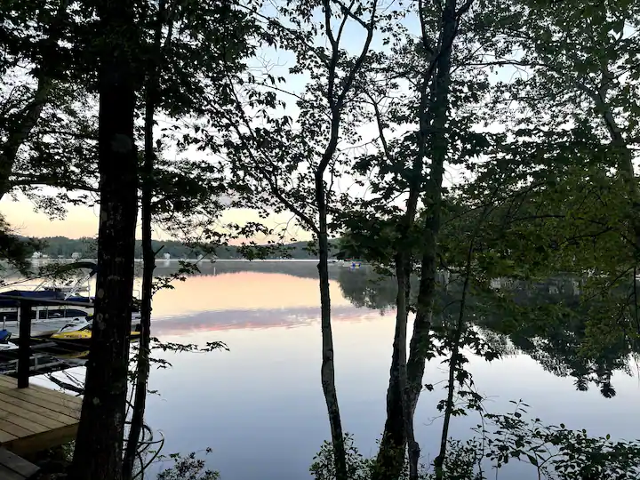 You'll pull into a paved parking area and then enter the house through the patio door via keyless entry. The cathedral main room takes in the view of the lake, enjoys wood floors, ceiling fan, windows to let the lake breeze blow through (there is a/c if you'd prefer) and cable and apple TV. Enjoy coffee or your favorite beverage on one of the two decks in comfy lounge chairs, comfy enough to nap in too. The patio has a "Solo" wood fire pit, outside dining and access to your own private dock (when the lake is "swimmable", of course we pull it for the colder months:)) We keep corn hole, lawn dice, spike ball and tiki toss nearby for the competitive side of you. The kayaks are ready to go out whenever you are, the resident eagles are impressive to catch a glimpse of and it's a rare day you don't see the loons. There is a dedicated work area for those moments when you must connect to reality. The bathrooms have been freshly renovated. The main bedroom has a king bed, double closets and a view of the lake, the second bedroom has two built-in twin beds and a built-in desk. Overflow sleeping in the built-in bunk that is located in a hallway is fun for all ages. There are yoga mats, board games, puzzles and a small library and a few toys to enjoy. There are extra throw blankets for curling up with your favorite book in the rocking chair. In the winter you can bring your ice skates, nordic skis or try your hand at ice fishing.
