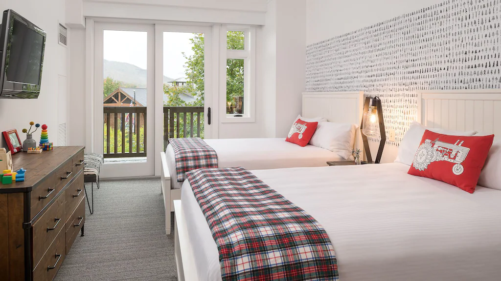 2 bedroom on the fourth floor with great views of Spruce Peak includes 1 king bed, 2 queen beds, pullout, 2 baths, & full kitchen.