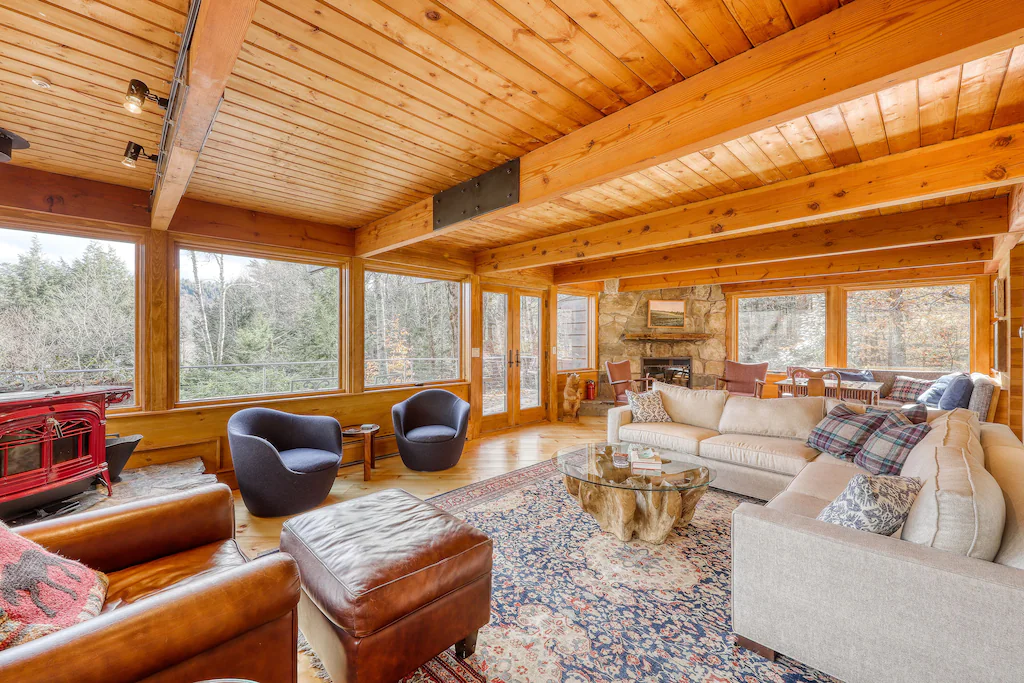 This secluded and private architect-designed lodge sits on eight acres and is ready to be your next home away from home in beautiful Warren, Vermont. Featuring a beautiful full kitchen, a furnished deck, and breathtaking treetop and mountain views, this rental is ideal for your next big family ski-cation or summertime getaway.