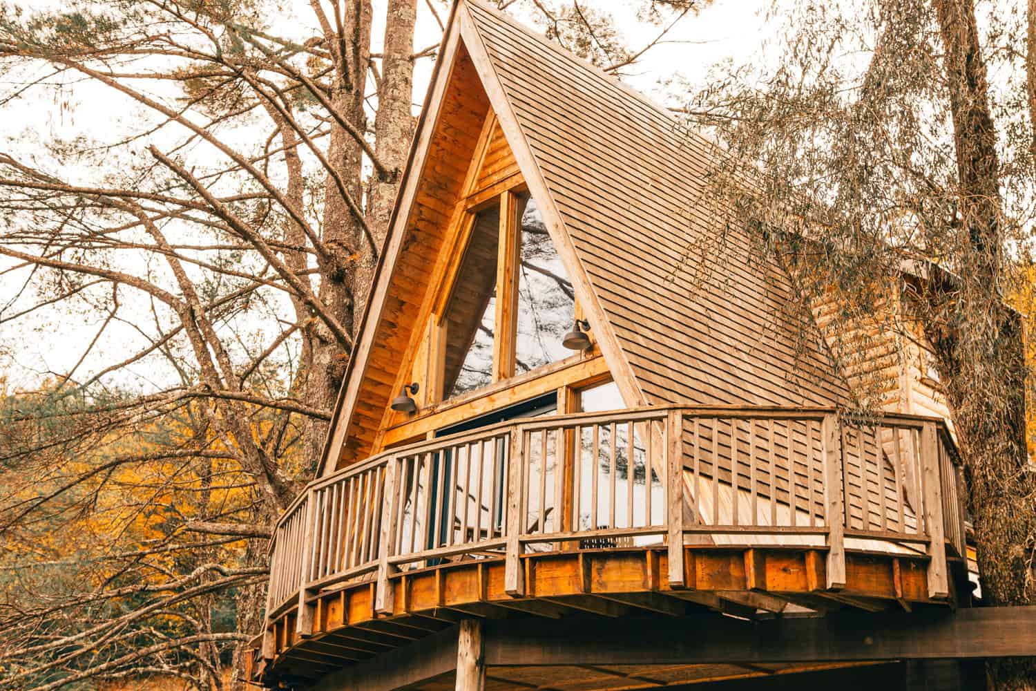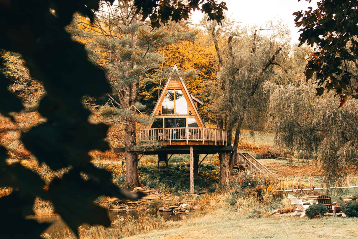 On the hill behind the main house is a modern and privately situated treehouse offering sanctuary for the lifelong adventurer! The treehouse includes a galley kitchen with microwave and mini fridge, loft bedroom, living room, bathroom, and a wrap-around deck overlooking a gorgeous pond. Its A-frame design with cedar and copper cladding fits right in with southern Vermont. The Treehouse is air conditioned and heated. It comes equipped with electric fireplace, linens, blow dryer, shampoo, conditioner, and locally made natural soap.